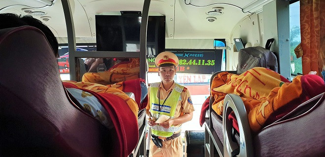 CSGT kiểm tra xe khách để phát hiện những vi phạm nhằm xử lý nghiêm, đảm bảo phòng ngừa TNGT