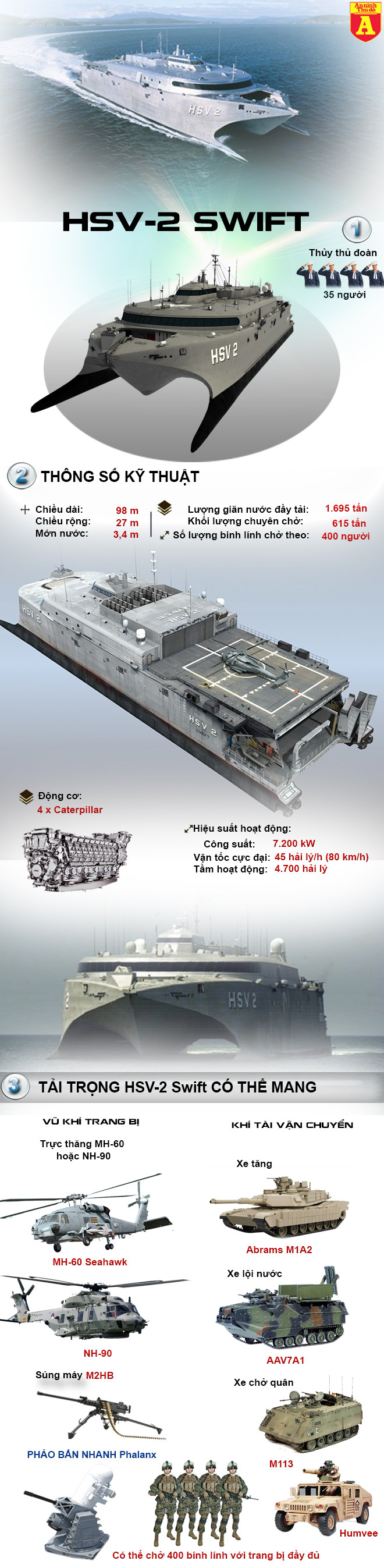 HSV Swift là loại tàu vận tải đổ bộ siêu nhanh. Tàu có sử dụng 4 động cơ Caterpillar, mỗi động cơ có công suất là 7200 kw. HSV-2 có thể đạt được vận tốc tối đa là 45 hải lý trong mỗi giờ, tầm hoạt động 4700 hải lý, thủy thủ đoàn gồm 5 sỹ quan và 30 thủy thủ.