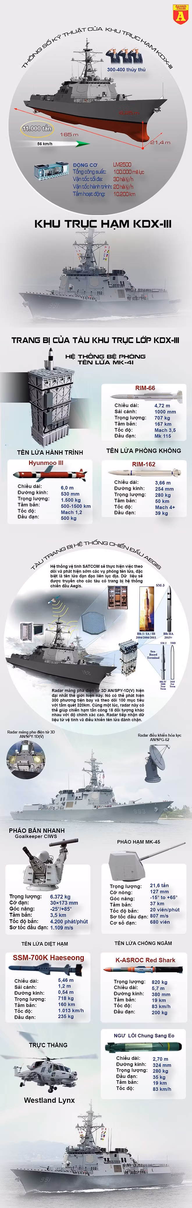 Hải quân Hàn Quốc đang có tổng cộng 3 khu trục hạm KDX-III trong biên chế, đây chính là những chiến hạm Aegis lớn nhất thế giới vào thời điểm hiện tại, đóng vai trò cực kỳ quan trọng trong việc lập lá chắn tên lửa đạn đạo ngoài khơi nhằm bảo vệ đất liền trước những cuộc tấn công từ đối phương. Đây được coi là cú đấm thép trên biển của hải quân Hàn Quốc.