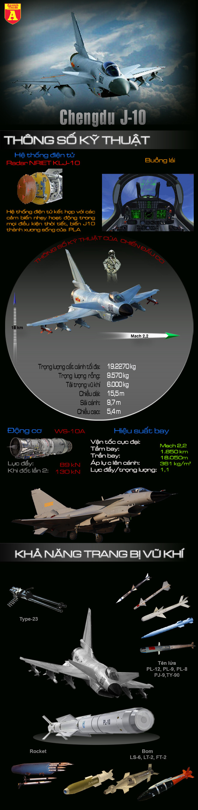 Tiêm kích đa năng J-10 (phương Tây đặt biệt danh “Vigorous Dragon – con rồng hùng mạnh) do Tập đoàn Công nghiệp Hàng không Thành Đô (CAC) Trung Quốc thiết kế và sản xuất trang bị chủ yếu cho Không quân Trung Quốc.