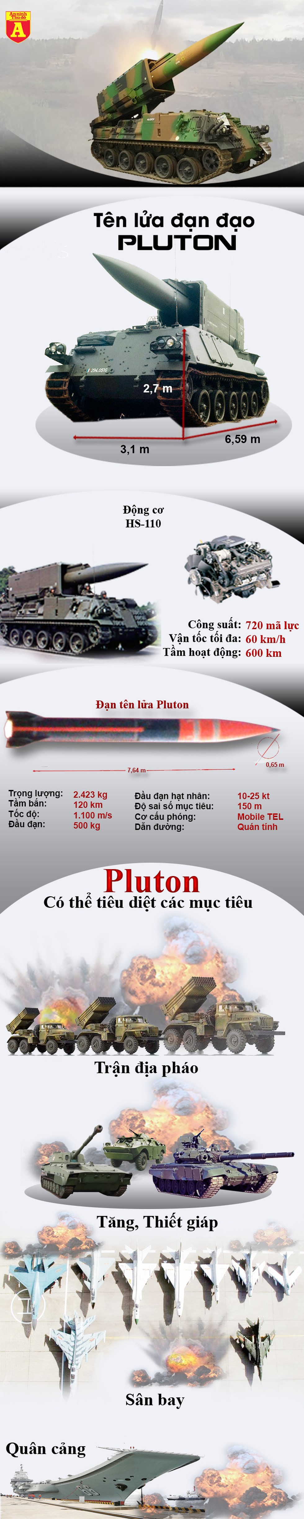 Ngoài đầu đạn thường, tên lửa đạn đạo chiến thuật Pluton còn có thể mang đầu đạn hạt nhân có đương lượng nổ lên tới 25 kt, tức có sức phá hủy còn lớn hơn cả quả bom nguyên tử của Mỹ từng thả xuống Hiroshima vốn chỉ có sức công phá 21 kt.