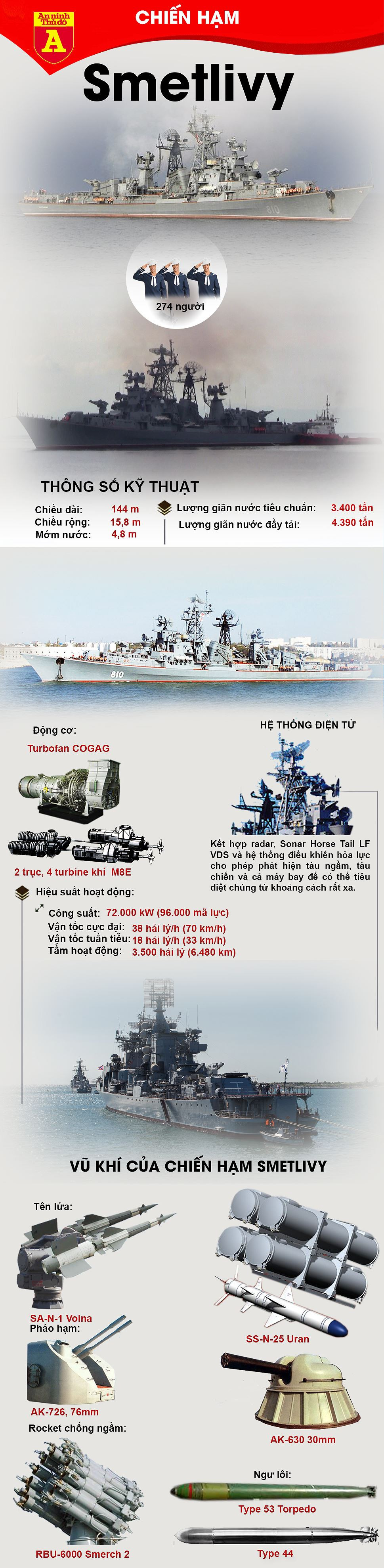 Khu trục hạm săn ngầm Smetlivy được hạ thủy vào ngày 15-7-1966 tại nhà máy đóng tàu Nikolaiev, bắt đầu hoạt động ngày 26-8-1967 và chính thức vào biên chế ngày 25-9-1969. Đây được đánh giá là một chiến hạm săn ngầm cực kỳ uy lực với vũ khí trang bị bao gồm: 1 pháo hạm nòng đôi AK-726 cỡ 76 mm, 2 ray phóng đôi của tên lửa phòng không SA-N-1 Volna với tổng cộng 32 tên lửa, 5 ống phóng ngư lôi cỡ 533 mm, 2 bệ phóng rocket săn ngầm RBU-6000 - loại rocket có thể diệt mục tiêu ở độ sâu tới 500m. Sau khi hiện đại hóa vào năm 1995, tàu được bổ sung 2 cụm 4 ống phóng KT-184 của tên lửa hành trình chống hạm SS-N-25 Uran.