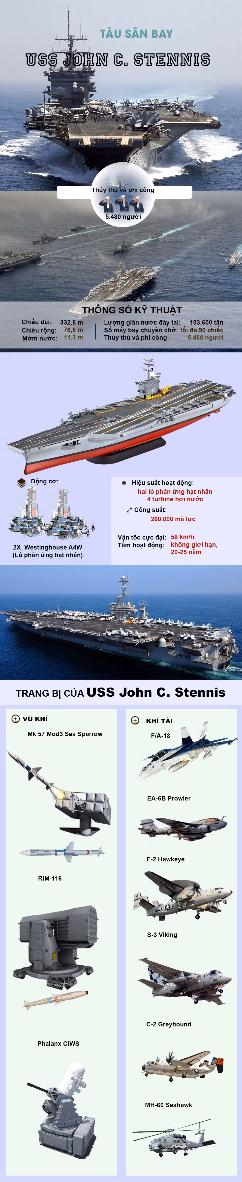 Tàu sân bay chạy bằng năng lượng hạt nhân USS Carl Vinson là một trong 10 chiếc tàu sân bay lớp Nimitz. Lượng giãn nước 103.500 tấn; đây là lớp tàu chiến lớn nhất trên thế giới. Với lượng giãn nước khổng lồ như vậy, tàu phải sử dụng 2 lò phản ứng hạt nhân A4W để tạo ra hơi nước áp lực cao, làm quay bốn trục chân vịt. Vì sử dụng năng lượng hạt nhân, nên tàu USS Carl Vinson có thể hoạt động trong vòng 20 năm mà không cần nạp nhiên liệu; và theo tính toán, tàu có thời gian phục vụ khoảng trên 50 năm. Tầm hoạt động của tàu không giới hạn, chỉ phụ thuộc vào khả năng tiếp tế hậu cần.Trong tác chiến, sức mạnh tiến công của cụm tàu sân bay USS Carl Vinson là liên đội không quân với hơn 90 máy bay các loại.