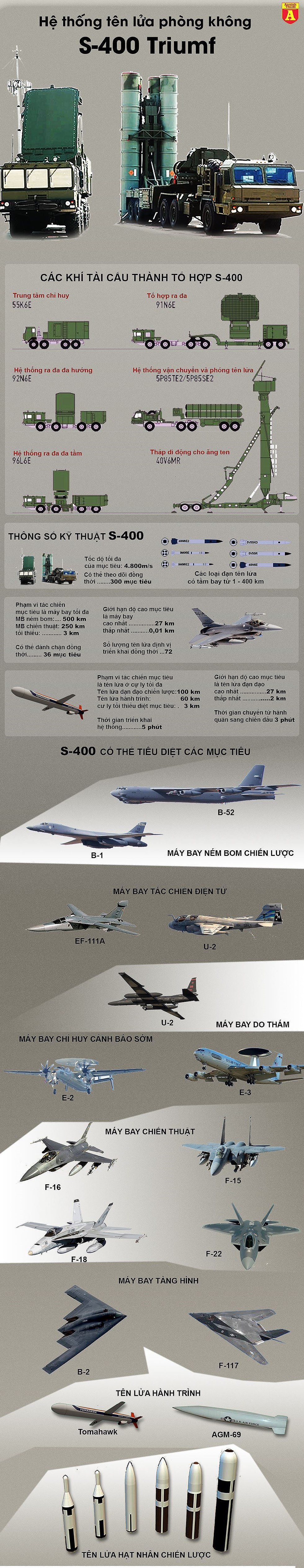 Với những tính năng vượt trội S-400 được đánh giá là một trong những vũ khí phòng không hàng đầu thế giới. Cùng xem thông số chi tiết loại vũ khí này qua infographic dưới đây.