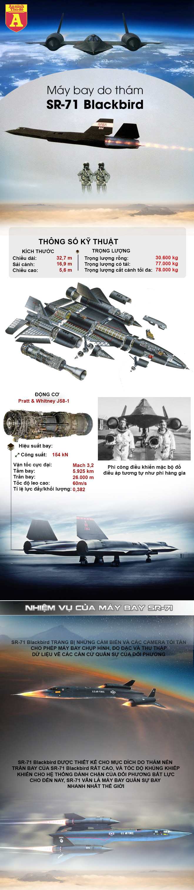 Với tốc độ khủng khiếp lên tới Mach 3,2 cùng trần bay 27km, SR-71 Blackbird được coi là máy bay quân sự siêu nhanh và cho đến nay vẫn chưa có một loại máy bay quân sự nào có thể phá vỡ kỷ lục của nó.