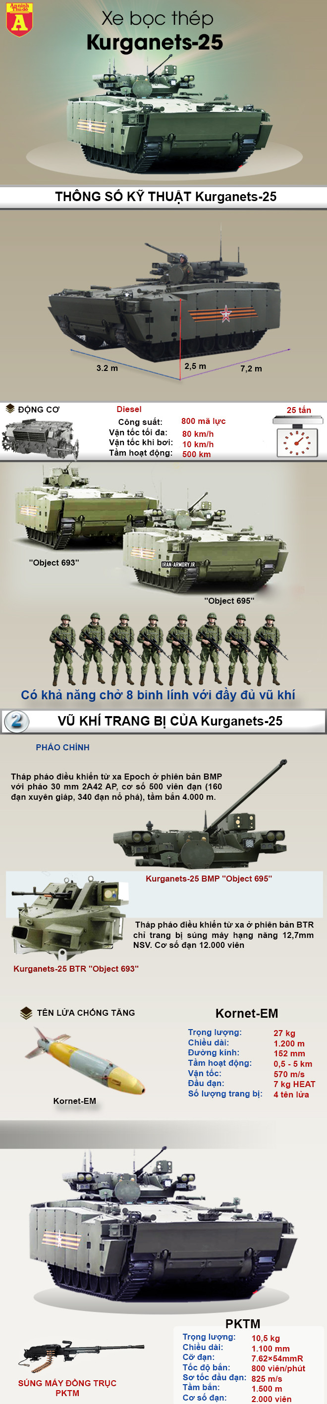 Kurganets-25 là dòng xe thiết giáp chở quân mới nhất của Nga, tuy là dòng thiết giáp chở quân nhưng nó lại được vũ trang cực mạnh với pháo tự động 2A42 cỡ 30mm với 500 viên đạn, súng máy đồng trục PKT 7,62mm, 4 tên lửa chống tăng có điều khiển Kornet-EM.