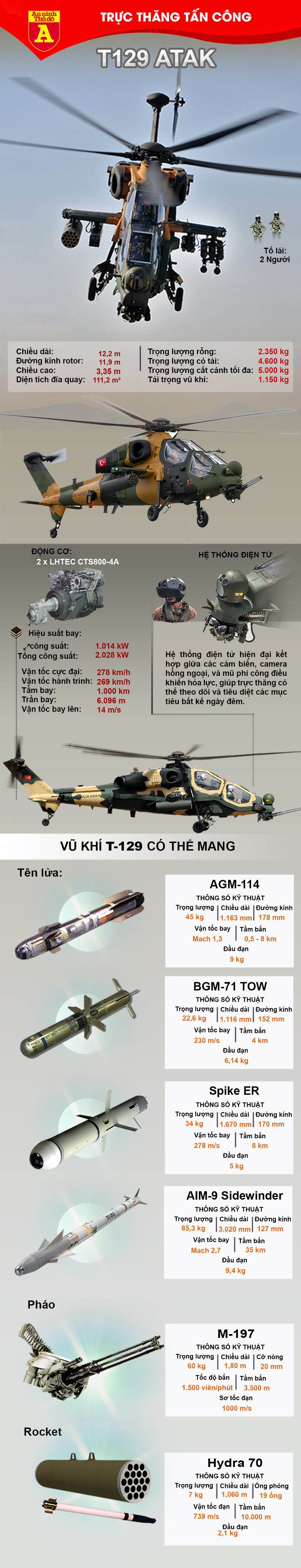 Ngoài tên lửa chống tăng, rocket, bom, trực thăng tấn công T-129 còn có khả năng mang được cả tên lửa không đối không. Loại trực thăng này được nghiên cứu vào năm 2009 và giới thiệu ra mắt công chúng vào năm 2014, và hiện có khoảng 30 chiếc T-129 đã được biên chế cho quân đội Thổ Nhĩ Kỳ. Hiện những chiếc T-126 vừa chứng minh sức mạnh tại chiến trường Syria khi chúng tấn công vào tuyến phòng thủ của người Kurd tại Afrin, góp phần đánh bại lực lượng này.