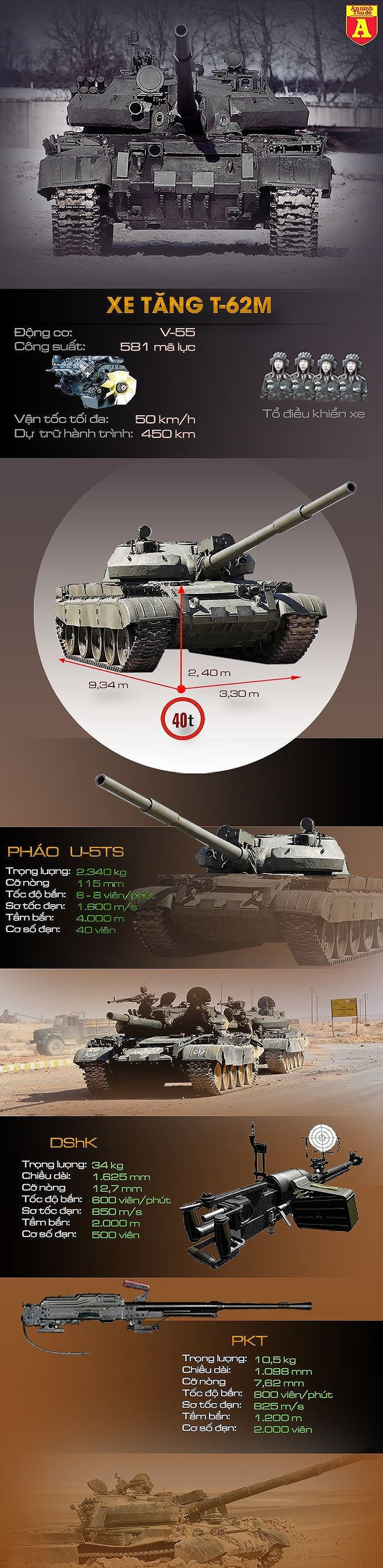 T-62M là biến thể nâng cấp hiện đại của xe tăng T-62 của Nga. Bị đánh giá thua kém T-72, T-90, tuy nhiên khi tham chiến tại Syria, chiếc T-62M của quân đội Syria đã thể hiện xuất sắc khi bảo vệ kíp lái an toàn và vẫn đứng vững không bị phá hủy ngay cả khi trúng tên lửa chống tăng TOW do Mỹ sản xuất.