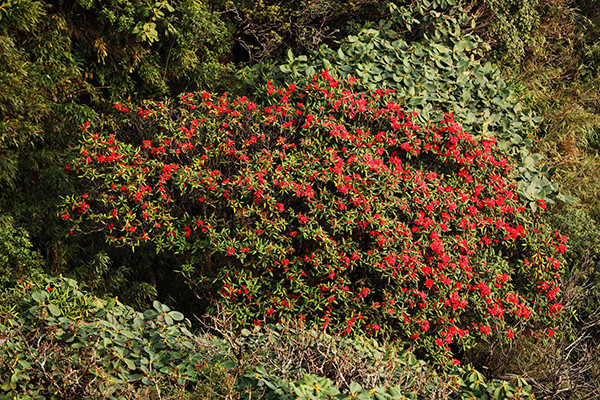 Trên khu vực đỉnh, đỗ quyên hoa vàng và đỏ tập trung nhiều ở đường La Hán, khu vực tượng Quan Thế Âm Bồ Tát và trên đường lên đỉnh cao 3143m, quanh khu vực Kim Sơn Bảo Thắng Tự… Đặc biệt quý hiếm là giống đỗ quyên quang trụ (hoa đỏ) có tuổi đời tới hơn 300 năm.