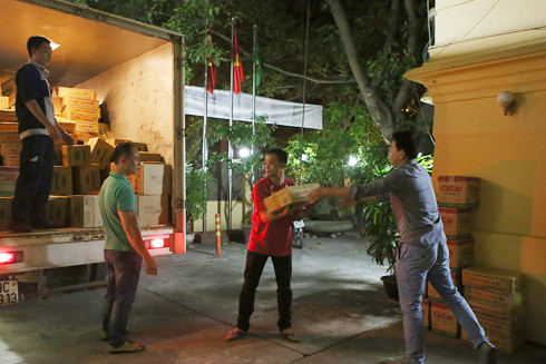Vận chuyển hàng cứu trợ đồng bào lũ lụt miền Trung lúc 23h30 đêm qua 17-10 tại trụ sở Báo ANTĐ