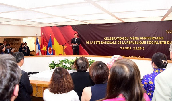 Bí thư Thành ủy Hà Nội Hoàng Trung Hải phát biểu tại buổi chiêu đãi Quốc khánh 2-9 do Đại sứ quán Việt Nam tại Pháp tổ chức