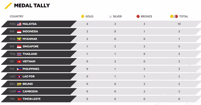 Tính tới hết giờ thi đấu buổi sáng, đoàn Thể thao Việt Nam hiện có 2 HCB, 1 HCĐ (đều của môn bắn cung), tạm xếp thứ 6 trên bảng tổng sắp, bám ngay sát Thái Lan (hạng 5, 1 HCV, 1 HCB). Bốn vị trí tốp đầu lần lượt thuộc về chủ nhà Malaysia (4 HCV), Indonesia (2 HCV, 1 HCĐ), Myanmar (2 HCV), Singapore (1 HCV, 2 HCB).
