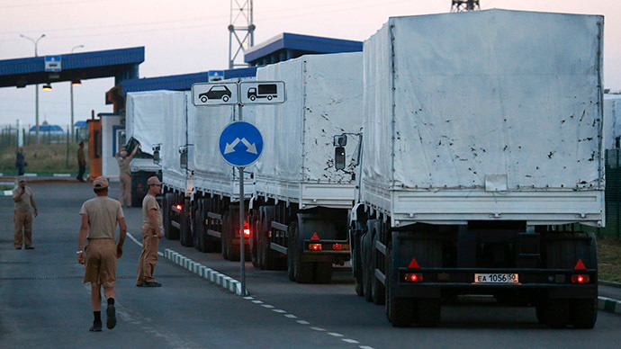 Vào hôm 20/8, 34 chiếc xe chở hàng viện trợ đầu tiên đã được cho phép đi qua lãnh thổ Nga – Ukraine, sau cuộc điện đàm trực tiếp của ngoại trưởng hai nước. Hai nhà lãnh đạo đã thống nhất về cách thức kiểm tra và phân phát hàng viện trợ. Tuy nhiên, ngày hôm sau, đoàn xe này bị chặn lại bởi quân đội Ukraine với lí do Lugansk đang bị công kích ác liệt. Nga cho rằng Ukraine đang cố tình đánh bom vào những địa điểm cần hàng viện trợ để lấy cớ dừng đoàn xe.