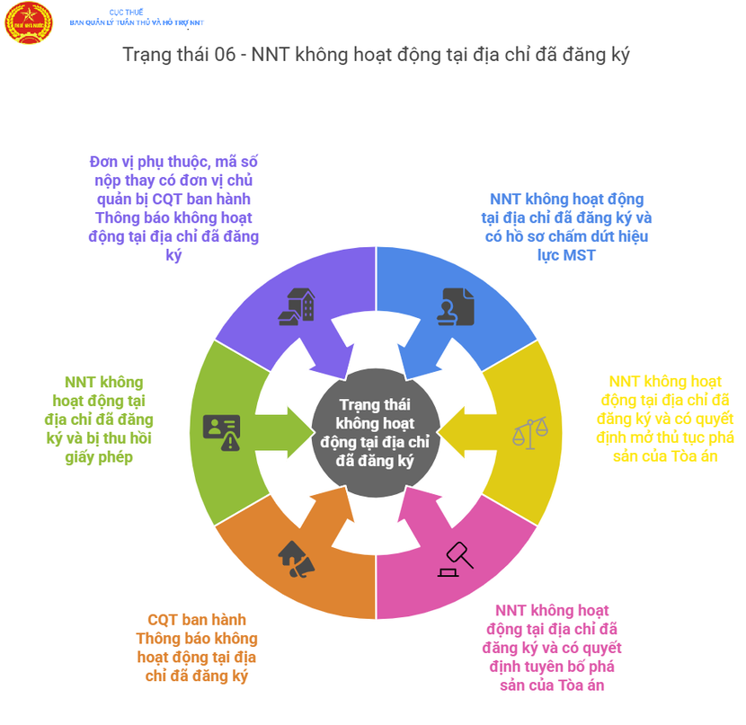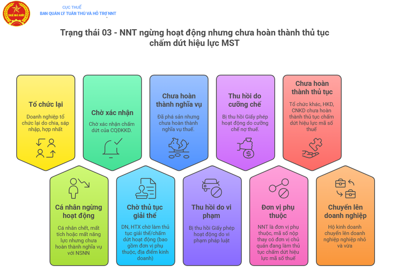 Theo Phụ lục I ban hành kèm theo Thông tư 86/2024/TT-BTC ngày 23/12/2024 thì có 10 lý do dẫn đến trạng thái 03: Người nộp thuế ngừng hoạt động nhưng chưa hoàn thành thủ tục chấm dứt hiệu lực mã số thuế và 06 lý do dẫn đến trạng thái 06: Người nộp thuế không hoạt động tại địa chỉ đã đăng ký: