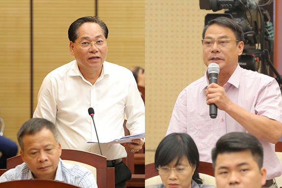 Chủ tịch UBND huyện Chương Mỹ Đinh Mạnh Hùng ̣̣(trái) và ông Nguyễn Ngọc Oanh - Giám đốc Công ty CP môi trường đô thị Xuân Mai tại phiên giải trình