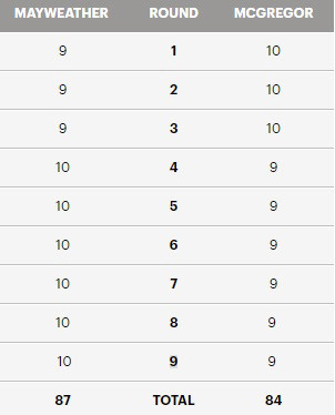 Với việc duy trì áp đảo từ thế trận tới điểm số liên tiếp từ hiệp 4 tới hiệp 10, Mayweather được trọng tài xử thắng (87 so với 84 điểm) khi McGregor gần như không còn sức lực phản kháng.