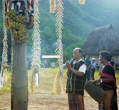 Buổi chiều trước lễ đâm trâu, các già làng đã tề tựu đông đủ dưới mái nhà Gươl làm lễ mời Giàng, mời thần linh về chứng giám cho lòng thành của dân làng. Từng tốp người tụ về quanh khoảnh sân rộng, họ mang theo gà, đầu lợn, bánh sừng trâu,… đến bên con trâu hiến tế, gửi vào lời khấn thành kính những ước nguyện về một năm sung túc. Dân làng ăn uống, nhảy múa theo tiếng cồng chiêng cho đến khuya. Còn các già làng ngồi khóc tế trâu trắng đêm. Mượn theo hát lý Cơ Tu và tiếng trống đệm các cụ khóc kể thảm thiết: Tiếng khóc vang vọng giữa đại ngàn, xuyên qua màn sương lạnh căm tạo thành một âm thanh kỳ bí. Dường như đất trời đang giao hòa làm một.