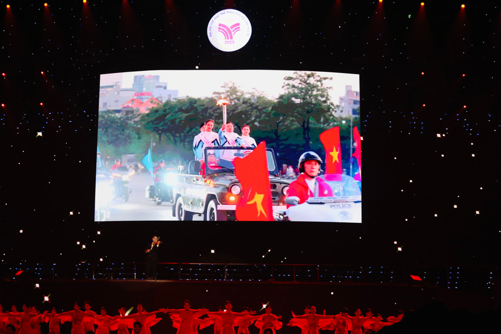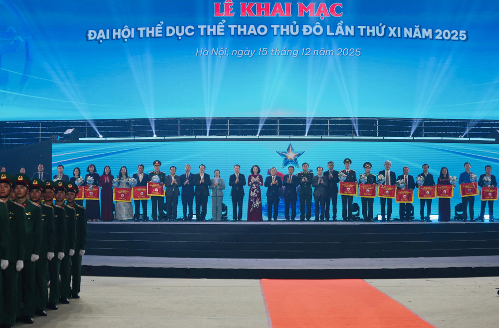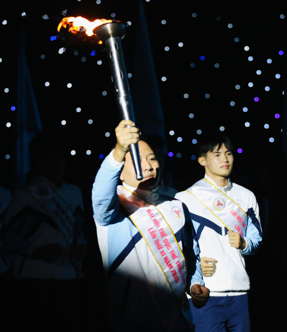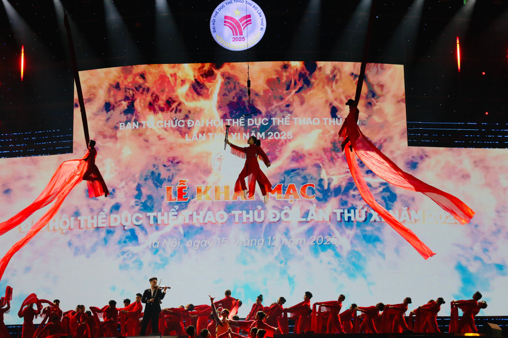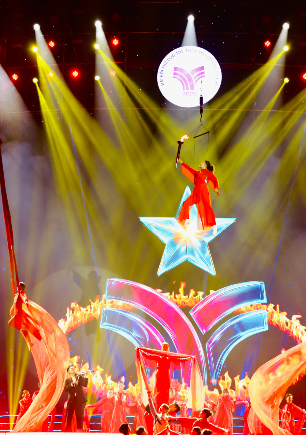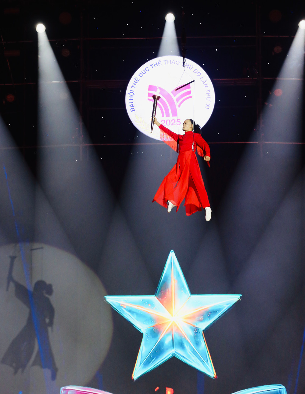 ANTD.VN - Màn thắp sáng đài đuốc được thực hiện trên không trung, kết hợp âm thanh, ánh sáng và các động tác đậm chất nghệ thuật của người thực hiện đã gây ấn tượng mạnh cho khán giả trong lễ khai mạc Đại hội Thể dục thể thao Thủ đô lần thứ XI-2025, tối 15-12.