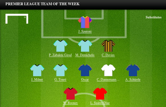 Sẽ là thiếu sót khi kết thúc ĐHTB tuần này mà không nhắc đến Luis Suarez của Liverpool. Trong trận đấu với 9 bàn thắng được ghi trên sân Cardiff City, tiền đạo người Uruguay đã lập một hat-trick để giúp đội bóng của anh giành chiến thắng 6-3, qua đó tiếp tục nuôi hi vọng trong cuộc đua đến ngôi vô địch.