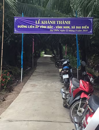 Chú Bảy Tình, 63 tuổi, người dân ở ấp Vĩnh Nam cười rạng rỡ, “hồi xưa xứ này đường trơn trượt. Mưa xuống, đất nở ra, nhão nhoét, tụi tui muốn vào nhà là phải gửi xe bên ngoài để lội bộ. Giờ có đường bê-tông đi lại ngon rồi, tụi nhỏ đi học không còn lội sình nữa mà người dân chở dừa ra ngoài bán cũng cao giá hơn chút đỉnh”. Chú Bảy Tình được xem là “người cực khổ nhất ấp” bởi trực tiếp giám sát quá trình thi công và vận động người dân trong ấp bỏ ngày công lao động ra làm đường.
