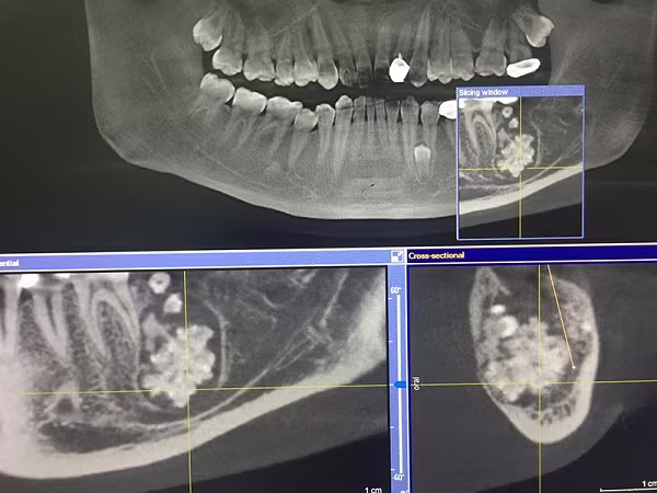 Trước đó, bệnh nhân này đến viện khám vì đau răng, sưng to gây biến dạng khuôn mặt. Tiếp hành chụp chiếu, các bác sĩ phát hiện trong khoang miệng bệnh nhân có khối u răng kích thước 3x4cm.