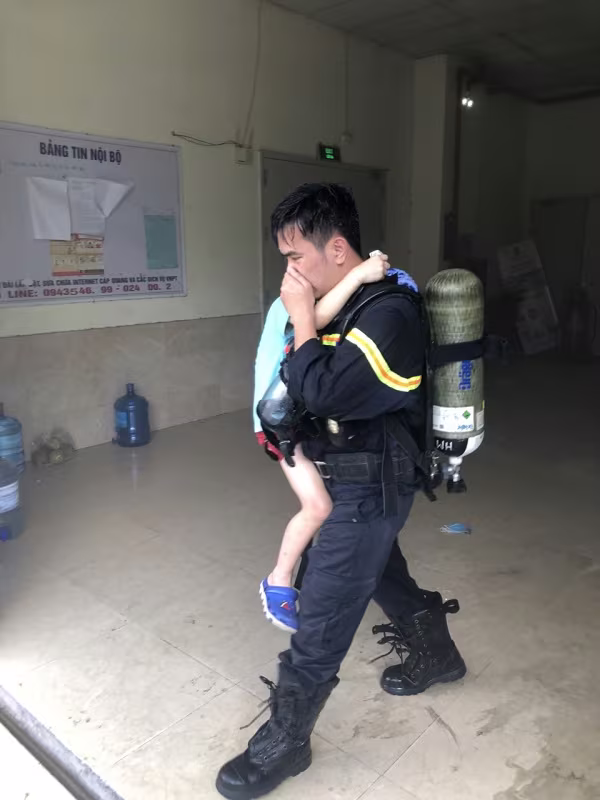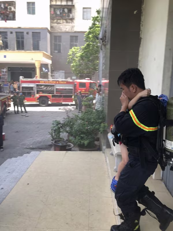 Cháu bé do hoảng sợ và không biết lối thoát đã được lính cứu hỏa cõng đưa từ trên cao xuống