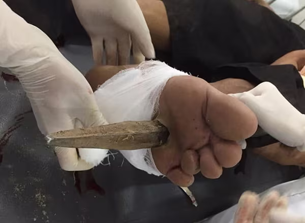 Bệnh nhân được đưa vào viện trong tình trạng bàn chân bị chiếc xà beng đâm xuyên thấu