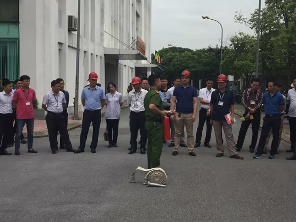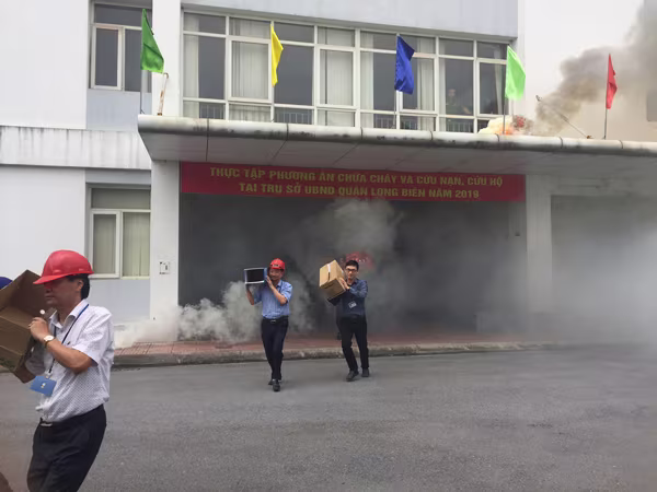 Cán bộ, nhân viên UBND quận Long Biên tham gia diễn tập PCCC, CNCH
