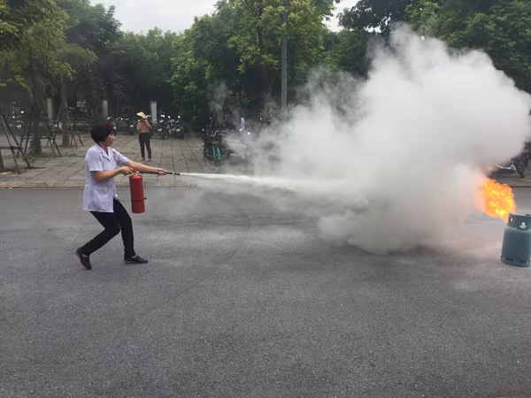 Người dân thực hành dập lửa bằng bình chữa cháy xách tay