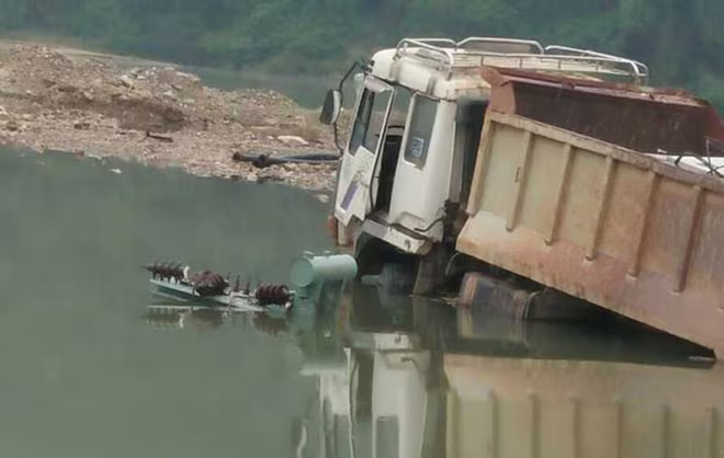 Chiếc xe ô tô tải hiệu Huyndai loại 18 tấn đang chìm dần trong "biển nước" khi Nhà máy điện Cẩm Thuỷ 1 bất ngờ tích nước để sản xuất điện