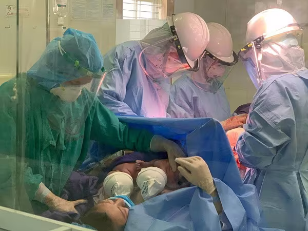 Sáng nay, thai phụ có dấu hiệu chuyển dạ nên được chuyển thẳng lên phòng mổ cách ly với các yêu cầu về kiểm soát nhiễm khuẩn được thực hiện chặt chẽ, nghiêm ngặt. Các bác sĩ đã mổ đẻ, lấy ra 2 bé song sinh có cân nặng lần lượt là 2,8kg và 2,6kg.