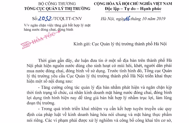 Công văn nêu rõ, Cục QLTT TP Hà Nội cần tăng cường công tác quản lý địa bàn nhằm phát hiện và ngăn chặn kịp thời tình trạng tổ chức, cá nhân kinh doanh mặt hàng nước đóng chai, đóng bình lợi dụng tình hình hiện nay để tăng giá bán bất hợp lý nhằm trục lợi, làm lũng đoạn thị trường.