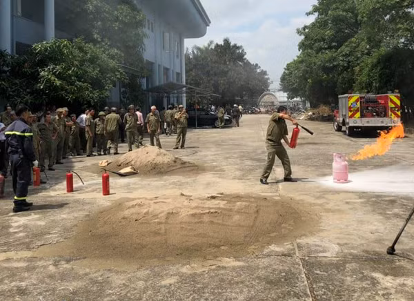 Các học viên thực hành sử dụng bình chữa cháy xách tay dập lửa an toàn