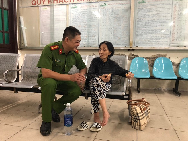 Trước đó, khoảng 21h tối 7-7, Trung tá Tạ Xuân Lộc - Phó Trưởng Đồn Công an đường sắt Ga Hà Nội cùng Thiếu tá Phạm Hồng Quân làm nhiệm vụ tuần tra kiểm soát, đảm bảo an ninh trật tự khu vực quanh ga thì phát hiện một cụ bà ngoài 80 tuổi đang ngồi ở đường ke số 6 cùng nhiều đồ đạc.