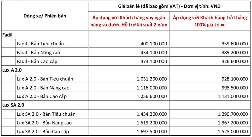 Theo đó, tất cả khách hàng mua ô tô VinFast Lux A2.0 và Lux SA2.0 đều được hưởng giá mới sau khi trừ trực tiếp hỗ trợ lệ phí trước bạ và quà tri ân (có giá trị lần lượt là 80 triệu đồng dành cho VinFast Lux A2.0 và 120 triệu đồng cho VinFast Lux SA2.0). Như vậy, khách hàng có thể dễ dàng sở hữu 2 dòng xe sedan và SUV cao cấp hạng E với giá cực tốt.