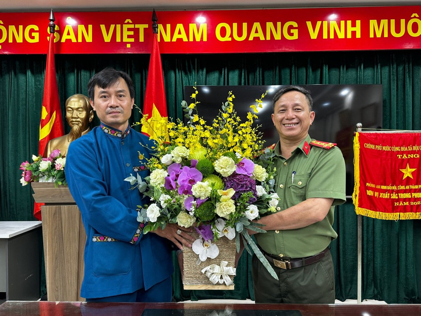 | Đại diện phòng chức năng CATP Hà Nội tặng hoa chúc mừng các chức sắc tôn giáo, người có uy tín trong dân tộc thiểu số có thành tích nổi bật trong phong trào Toàn dân bảo vệ an ninh Tổ quốc năm 2021, 2022 và 6 tháng đầu năm 2023 |