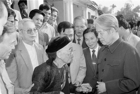 Tổng Bí thư Đỗ Mười nói chuyện thân mật với nhân dân xã Lê Lợi, huyện Thường Tín (Hà Tây cũ) năm 1992. Ảnh: TTXVN