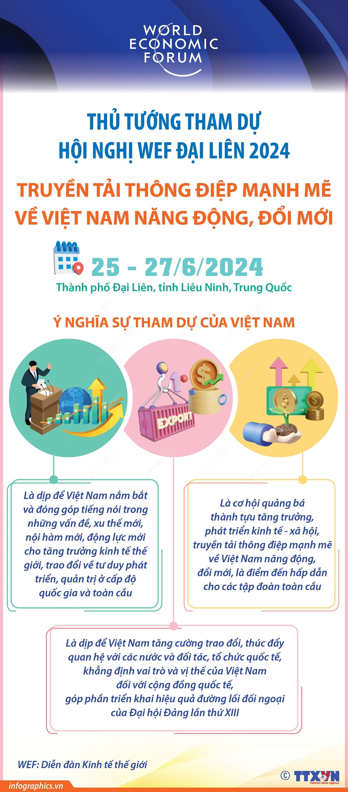 WEF Đại Liên 2024 được kỳ vọng là nơi hội tụ, kiến tạo những ý tưởng mới, các lĩnh vực mới, mô hình tiên phong, sáng tạo sẽ định hình các ngành kinh tế trong tương lai. Với việc tham gia và phát biểu tại hội nghị cũng như việc thông qua cuộc hội ngộ với giới lãnh đạo, giới hoạch định chính sách và cộng đồng doanh nghiệp toàn cầu, việc Thủ tướng Phạm Minh Chính tham dự WEF Đại Liên 2024 mở ra cơ hội giao thoa, hội nhập cho kinh tế Việt Nam với kinh tế thế giới, là dịp để Việt Nam giới thiệu ra thế giới những thành tựu phát triển kinh tế - xã hội nổi bật thời gian qua, thể hiện hình ảnh một Việt Nam năng động, tích cực hội nhập, tự tin và nhiều sức hút đối với các tập đoàn toàn cầu, qua đó thúc đẩy hợp tác cùng có lợi, thu hút nguồn lực để phát triển đất nước. Cũng thông qua hội nghị lần này, chúng ta có thể nắm bắt những vấn đề, xu thế mới của kinh tế thế giới; cùng các bên trao đổi về tư duy phát triển, quản trị ở cấp độ quốc gia và toàn cầu; đóng góp vào xử lý các vấn đề chung của thế giới như thúc đẩy tăng trưởng, phát triển các ngành công nghiệp mới, ứng phó với biến đổi khí hậu, bảo đảm an ninh lương thực.
