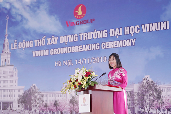 Bà Lê Mai Lan – Phó Chủ tịch Tập đoàn Vingroup, kiêm Giám đốc Điều hành dự án Đại học VinUni phát biểu lại lễ động thổ xây dựng trường Đại học VinUni.