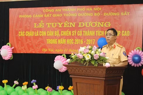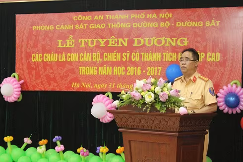 Đại tá Đào Vịnh Thắng, Trưởng Phòng Cảnh sát giao thông đường bộ, đường sắt CATP Hà Nội trao phần thưởng cho con em CBCS đạt giải cao trong năm học 2016 - 2017