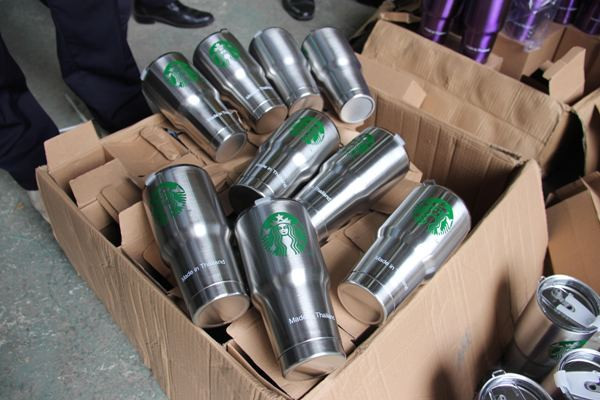 Cũng tại thời điểm kiểm tra, Tổ công tác phát hiện có 8 người đang thực hiện việc in ấn logo (hình giống với các thương hiệu Versace, Burberry, Starbucks) lên cốc giữ nhiệt có in chữ “Made in Thailand”.