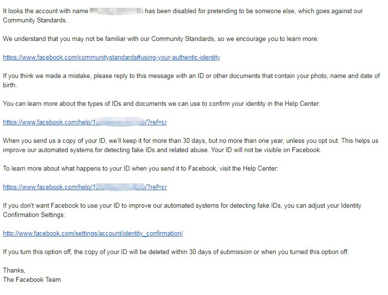 Cụ thể, khi Facebook treo tài khoản bị báo cáo, MXH này cũng đồng thời gửi một email tới người dùng để thông báo, và đề nghị gửi kèm ảnh chụp giấy tờ tùy thân (thường là CMND) để xác thực.