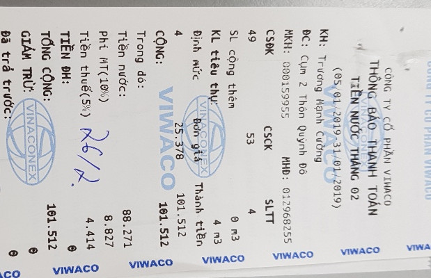 Từ đó đến nay, hàng tháng, các hộ dân đều trả tiền nước thông qua nhân viên của Viwaco đến thu trực tiếp. Sau khi nộp tiền, các hộ được phát hóa đơn ghi nhận việc đã trả tiền.