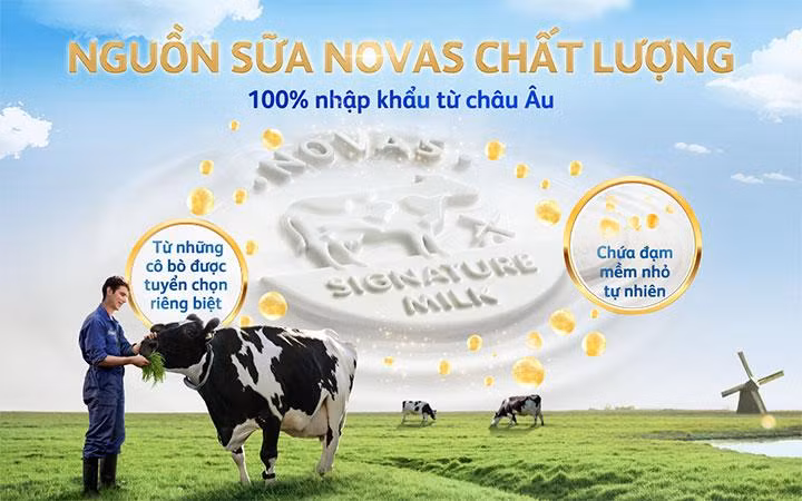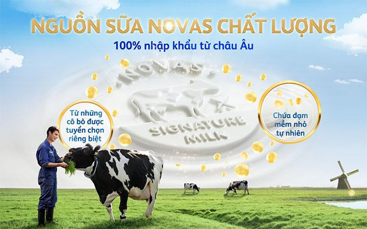 Novas là nguồn sữa chứa phân tử đạm nhỏ tự nhiên, cấu trúc mềm nhẹ, tốt cho hệ tiêu hóa. Sữa Novas được thu hoạch từ giống bò của hơn 19.000 nông trại chăn nuôi tại Hà Lan, được tuyển chọn và nuôi dưỡng với chế độ dinh dưỡng hợp lý và chăm sóc khoa học, đảm bảo sữa nguyên liệu có chất lượng tốt, cân bằng đạm, vitamin, khoáng chất cùng các thành phần thiết yếu khác. Với qui trình kiểm soát nghiêm ngặt và khép kín, chất lượng sữa Novas luôn được duy trì qua sự tươi ngon tự nhiên, hàm lượng đạm chất lượng cao, giúp bé dễ hấp thu và có hệ tiêu hóa khỏe mạnh.