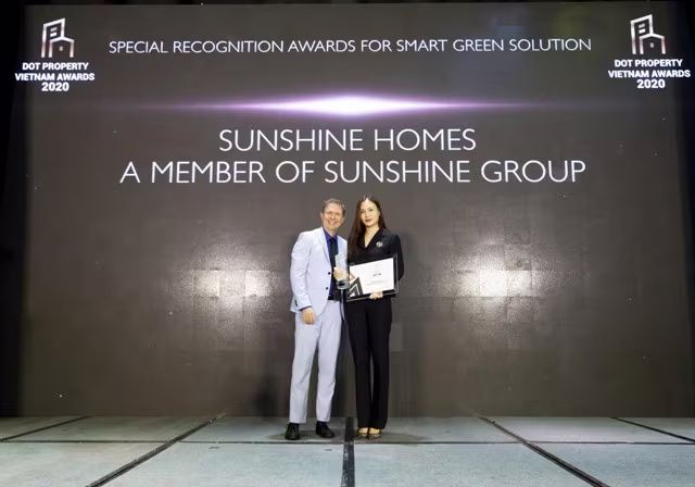 Trong khuôn khổ giải thưởng DOT Property Vietnam Awards 2020, Sunshine Homes và dựán của mình cùng lúc được vinh danh tại hạng mục về xu hướng xanh. Nếu Sunshine Homes được giới chuyên gia và những người quan tâm đề cao với “Giải thưởng công nhận đặc biệt cho giải pháp Xanh – thông minh 2020” thì Sunshine Crystal River - một sản phẩm của Sunshine Homes lại được xướng danh là “Tổ hợp biệt thự trên không xu hướng xanh tốt nhất Việt Nam 2020”.