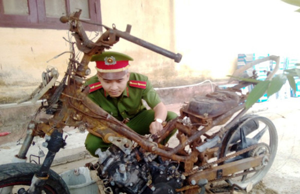 Chiếc xe máy bị Hùng đốt chỉ còn trơ khung sắt