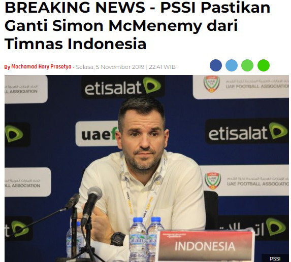 Tờ Bola Sports đưa tin PSSI sa thải HLV McMenemy sau cuộc họp chiều 5-11