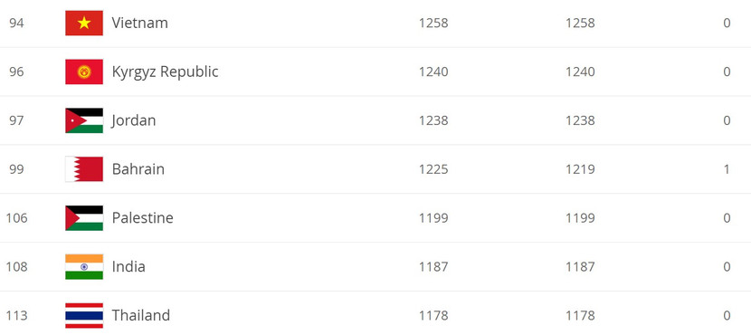 ĐT Việt Nam xếp thứ 94 thế giới và 14 tại châu Á