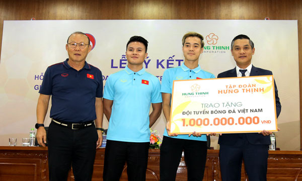 Ngay sau lễ ký kết, "Mạnh Thường Quân" này đã trao thưởng 1 tỷ đồng cho các thành viên đội tuyển Việt Nam, với chiến thắng 1-0 trước Malaysia trên sân Mỹ Đình ở vòng loại World Cup 2022 hồi tháng trước. Cá nhân tiền vệ Quang Hải, tác giả bàn thắng duy nhất của trận đấu được thưởng 200 triệu đồng.
