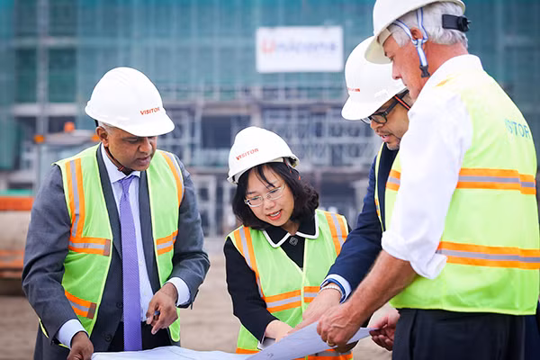 TS. Lê Mai Lan, GS. Rohit Verma cùng các Giáo sư Cornell trên công trường xây dựng trao đổi về tiến độ xây ký túc xá và khu labs trong khuôn viên Đại học VinUni.